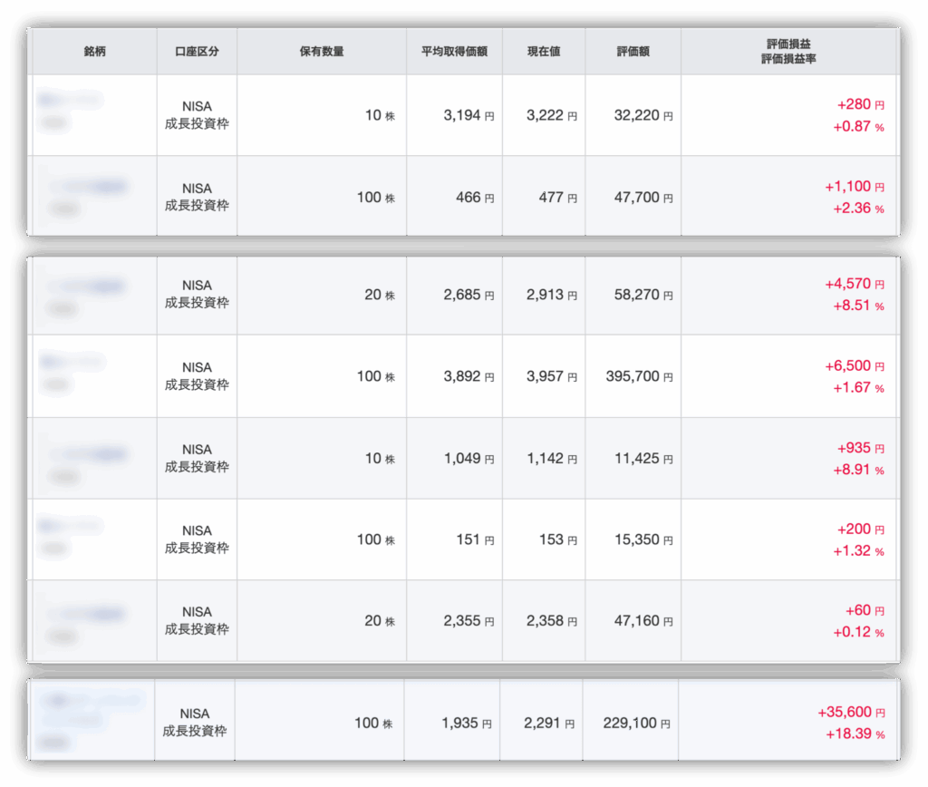 今は個別株を1から勉強しているところで、実際にもっている株の状況はこんな感じだよ。