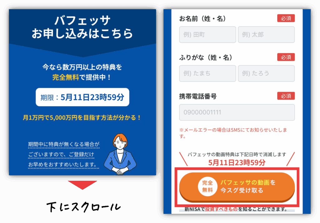名前と携帯電話番号を入力したら「バフェッサの動画を今スグ受け取る」をタップ!