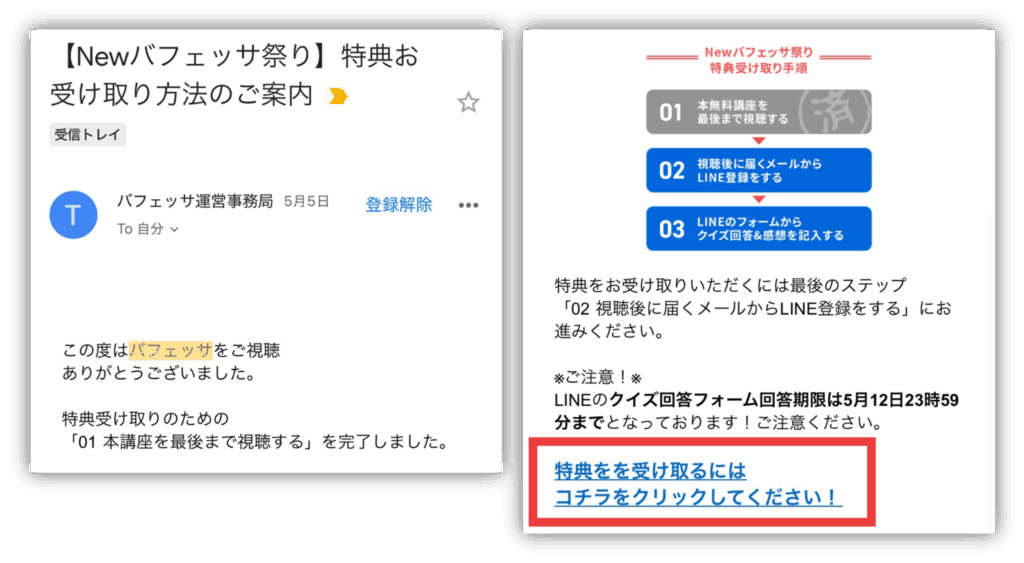 メールに記載の「特典を受け取るにはコチラをクリックしてください!」をタップしてね。