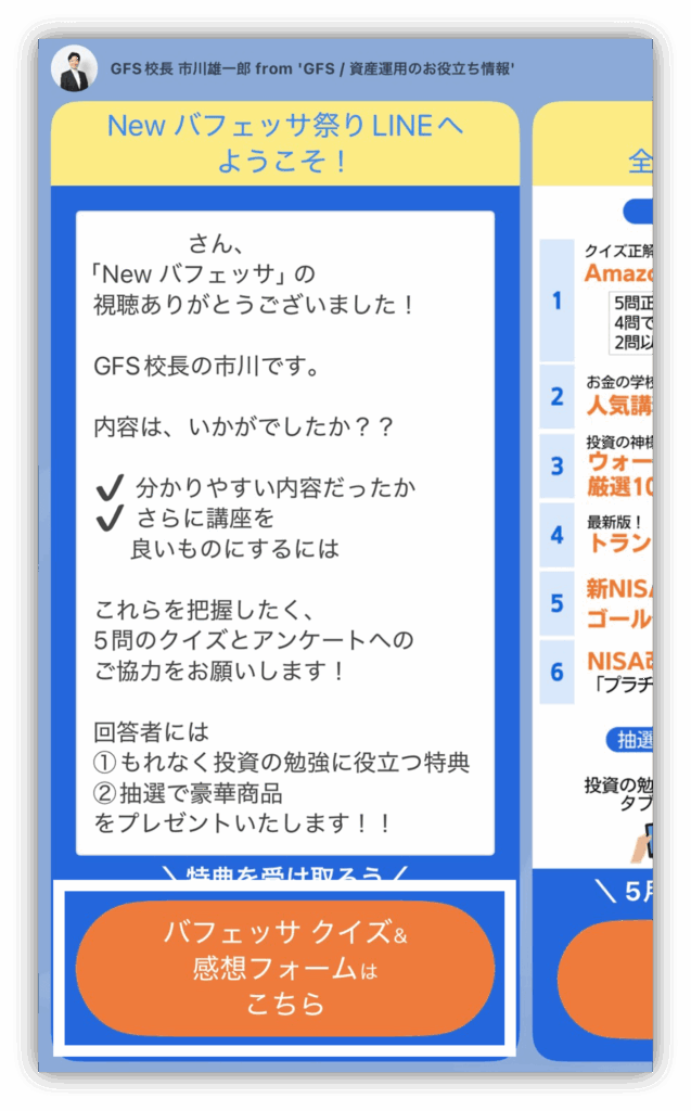 バフェッサの本編動画の途中には、運営元の投資スクール「GFS」の案内があるよ。