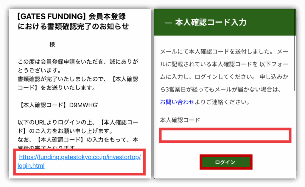 URLをタップして、本人確認コードを入力したら「ログイン」をタップ。