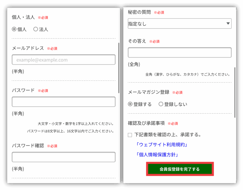 メールアドレスやパスワードを入力して、規約を確認したら「会員仮登録を完了する」をタップ!
