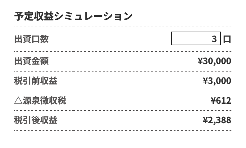 一方で、同じ金額をGATES FUNDINGの利回り10.0%の案件に投資した場合、1年後に2,388円(税引後)受け取れる計算だよ😳
